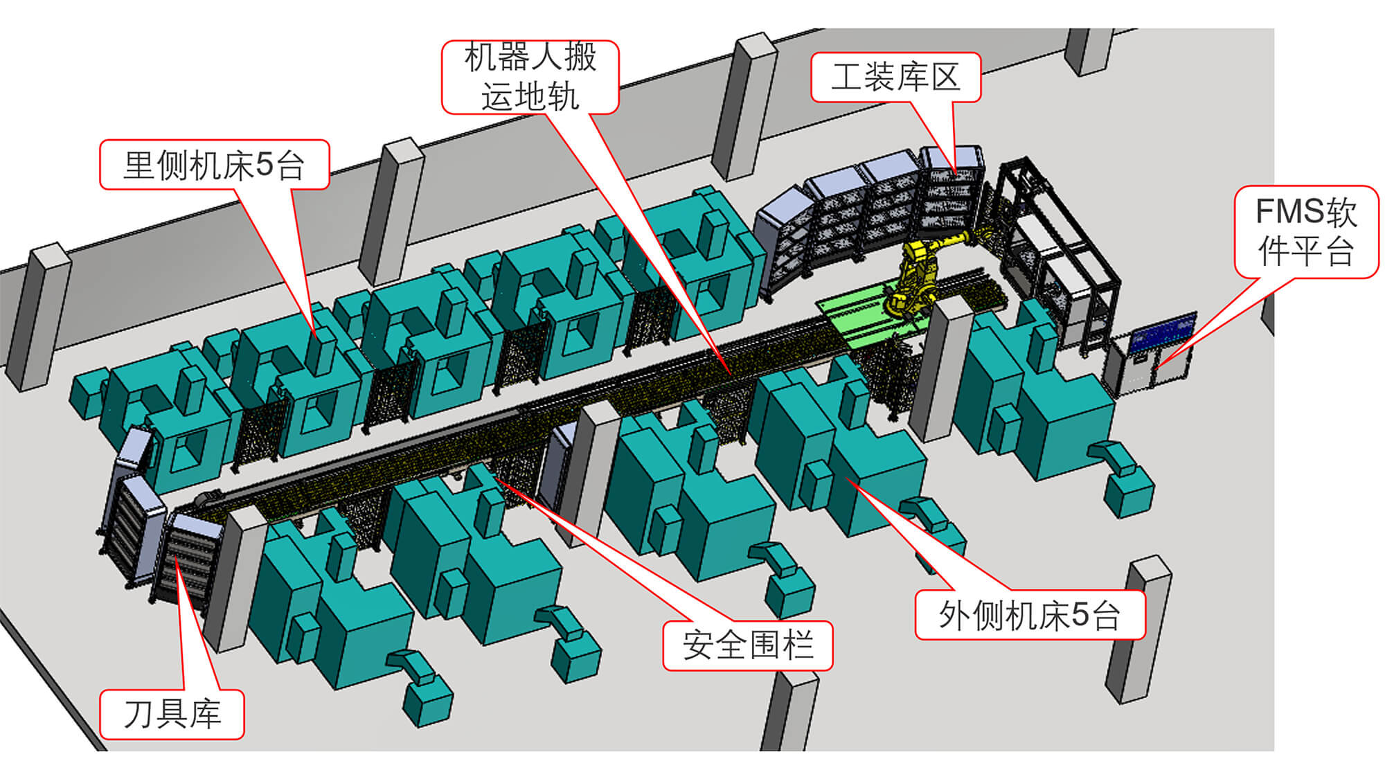 4臺(tái)機(jī)床、4個(gè)工裝料庫(kù),一套柔性化系統(tǒng)組成